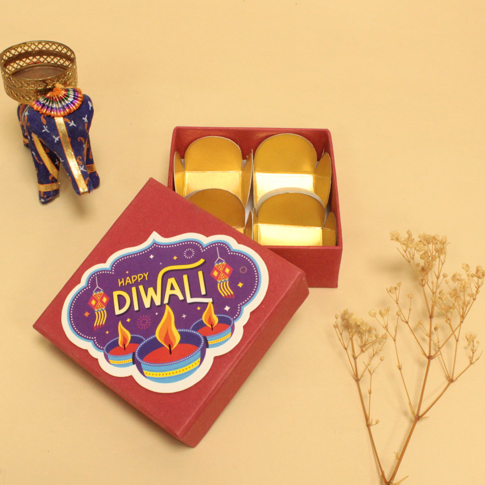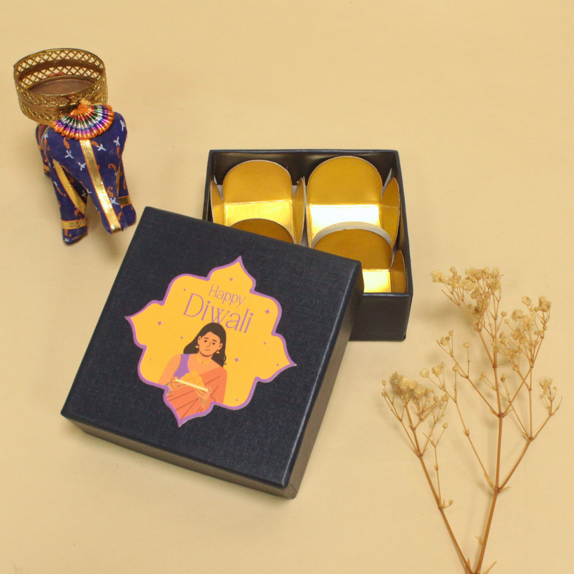 4 Cavity Diwali Box – Premium Rigid Box for Sweets (4×4×1.5 Inches)
